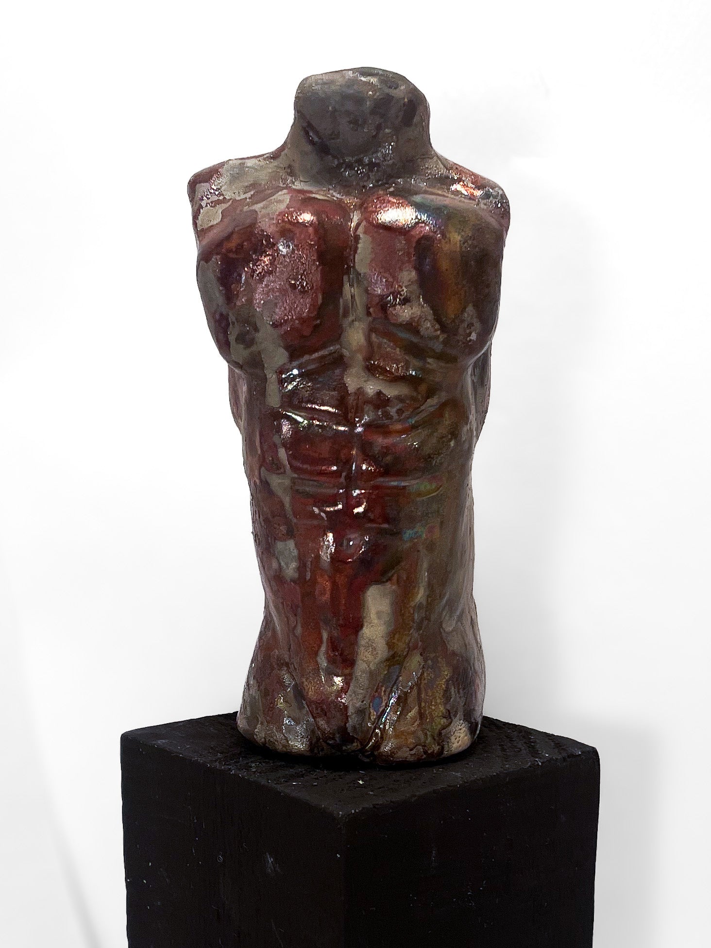 Esta escultura única de cerámica representa un torso humano masculino sin cabeza, modelado con exageración anatómica y una intensidad expresiva que evoca tanto fuerza como vulnerabilidad. Realizada con la técnica japonesa de Raku, cada pieza es irrepetible, ya que el fuego y el humo interactúan de forma impredecible con los esmaltes, generando una superficie rica en matices metálicos, rojos profundos, bronces y reflejos iridiscentes.